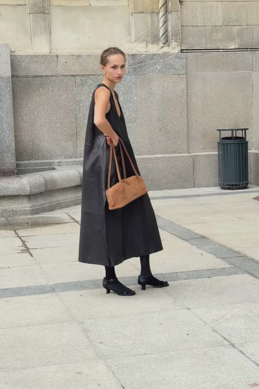 Torebka bowling z długimi rączkami. Charakterystyczna forma trapezu to must-have tego sezonu. Mięsisty zamsz w kolorze brązowej ochry podkreśla geometryczną formę.