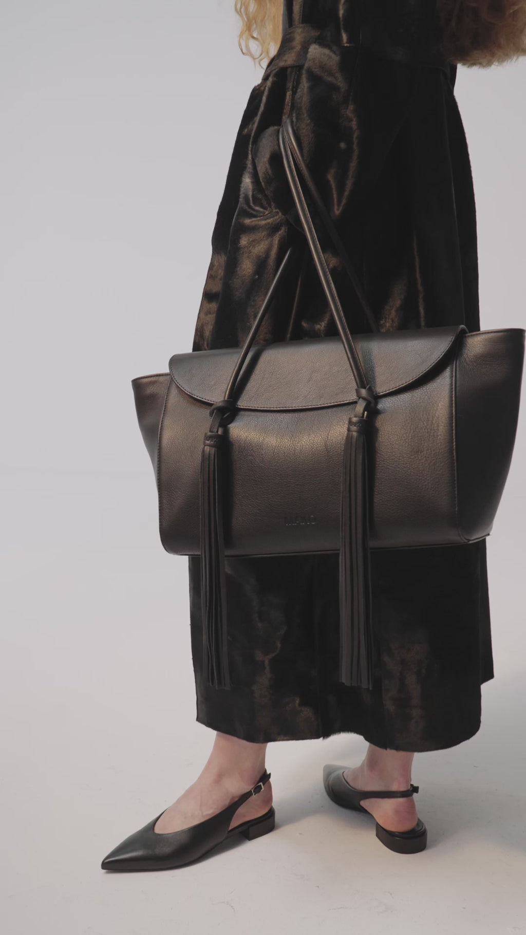 Tote Bag o podłużnym kształcie. Elonge Tote łączy funkcjonalność z współczesną formą. Wykonana z najwyższej jakości, starannie wyselekcjonowanej gładkiej skóry naturalnej o matowym wykończeniu, zachwyca szlachetną fakturą i trwałością.